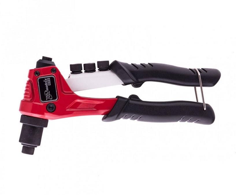 Заклепочник 250 мм MATRIX 40524 позволяет крепко соединить два листа железа. Используется для клепания заклепок разных диаметров. Головка снабжена сменными насадками, которые идут в комплекте и крепятся на инструменте, что добавляет удобство в работе. Благодаря специальной скобе можно зафиксировать положение рукояток.