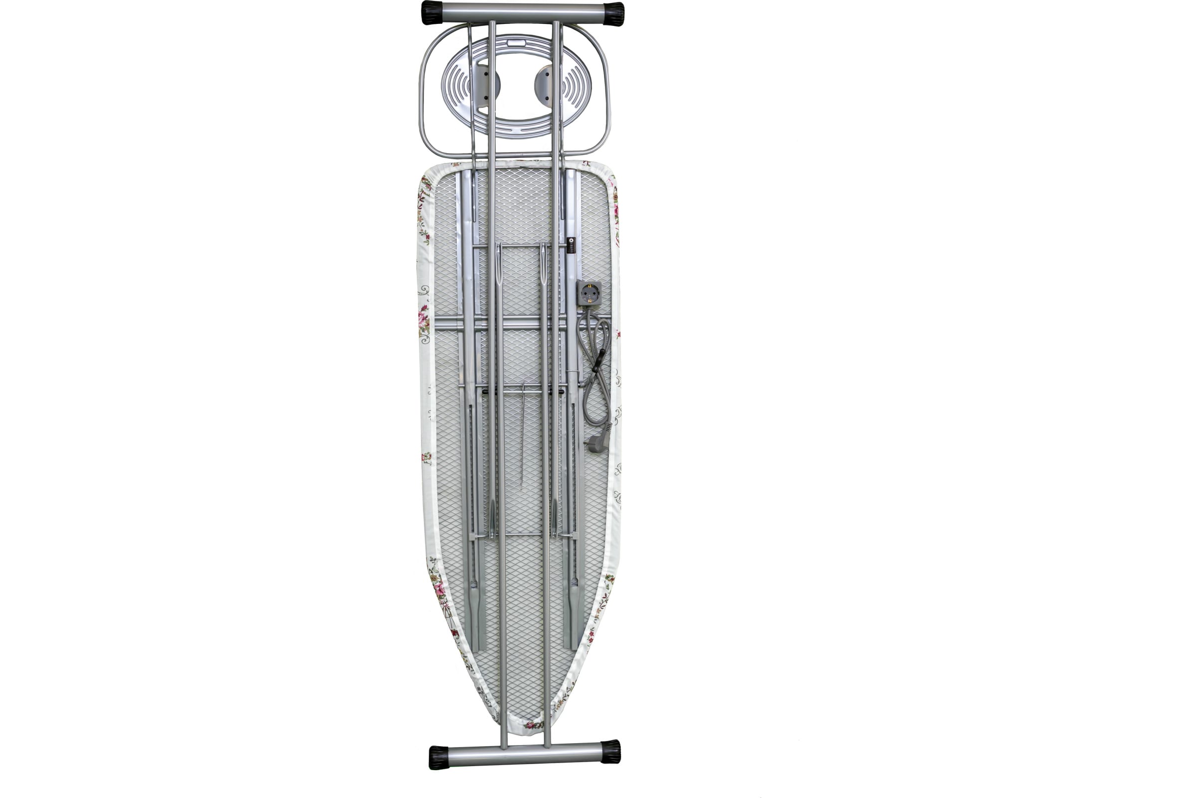 Доска оснащена подставкой для утюга и электроудлинителем. Ножки с накладками препятствуют скольжению и образованию царапин на полу. Гладильная доска легко складывается и не занимает много места.